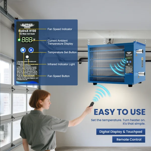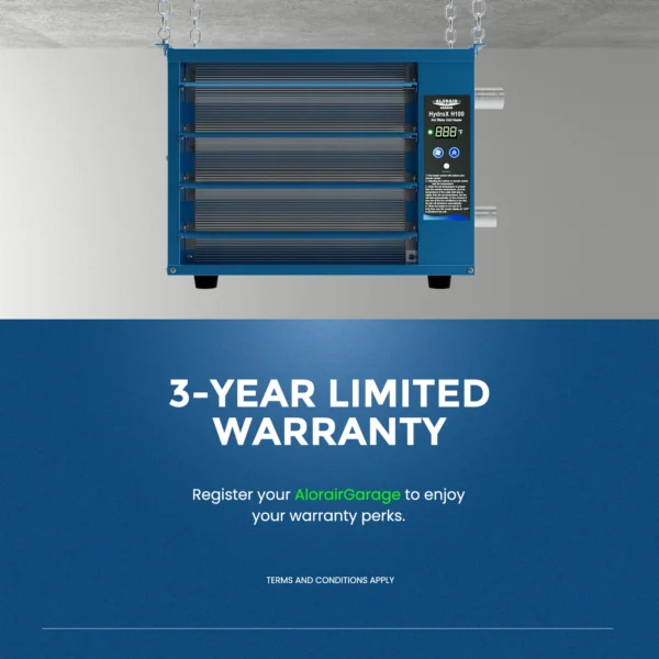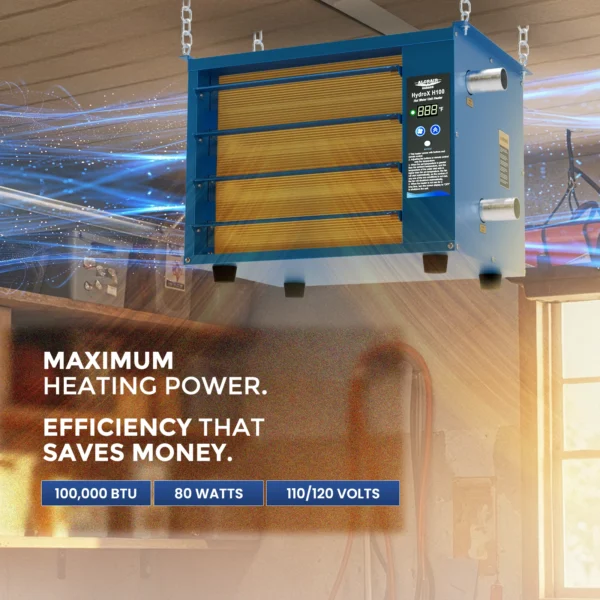 AlorairGarage HydroX H100 has an immense heating capacity at 100,000 BTU, excellent for heating garages and other spaces measuring up to 3,000 sq.ft.